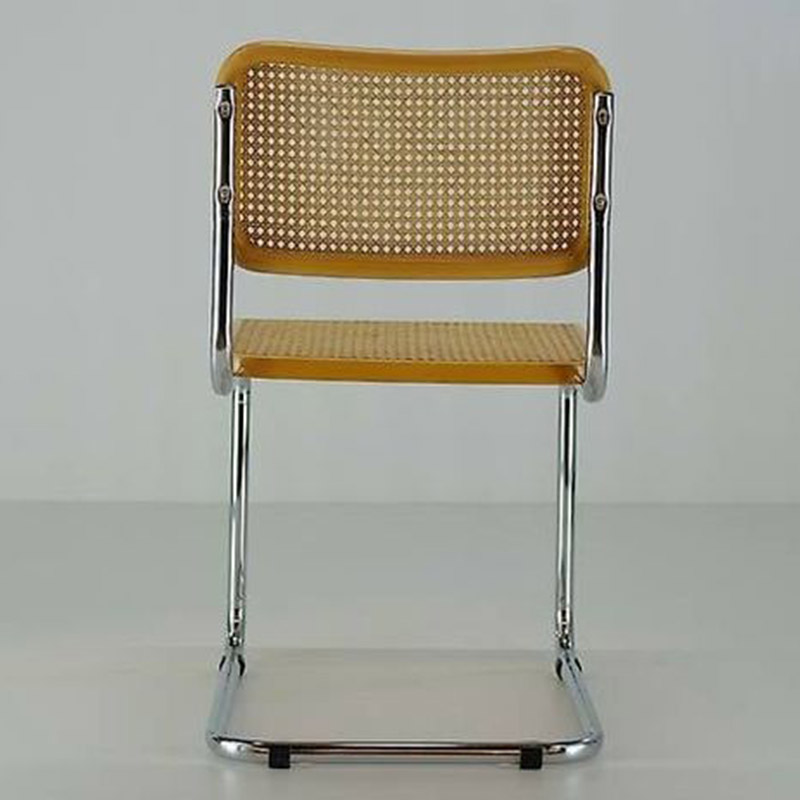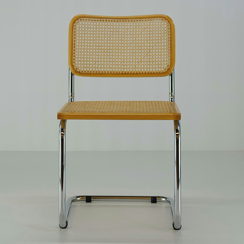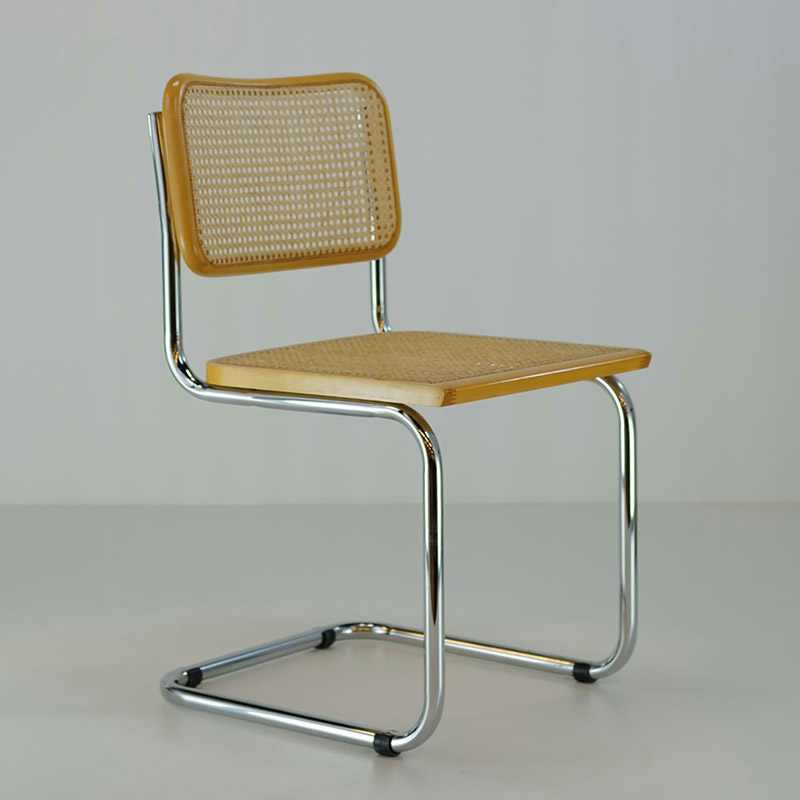 Klassischer Freischwinger im Bauhaus-Stil, mit verchromtem Stahlrohrgestell und Sitz sowie Rückenlehne aus hellem Holzrahmen mit naturfarbenem Wiener Geflecht. Zeitloses Design, stabil und zugleich elegant – perfekt für Esszimmer, Büro oder Wohnzimmer.
